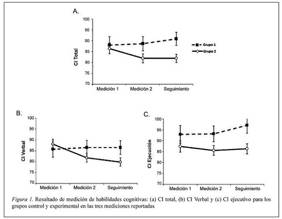 A través del mismo ANOVA de mediciones repetidas, en el CI Ejecutivo no se registraron cambios en el tiempo para ninguno de los dos grupos (F [2, 112]= 1.291, p= 0.23). A diferencia de esto, el CI verbal mostró el mismo patrón del CI total; esto es, un descenso estadísticamente significativo entre la primera y la segunda medición para el Grupo 2 (F [2, 112]= 4.184, p<0.05) con tendencia hacia el declive. Este efecto se observa diferenciado entre los colegios (F [1, 56]=5.86, p<0.01) con cambio significativo en el grupo 2.