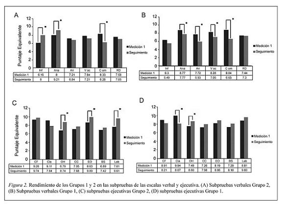 Las trece subpruebas que forman el WISC-IIIv.ch. fueron analizadas y se observó una marcada tendencia de cambio, hacia la baja, para las subpruebas que forman el CI Verbal en el Grupo 2 (ver Figura 2). Específicamente se observa una disminución significativa para Analogías (t [42]= 2.790, p= .008), Aritmética (t [42]= 3.648, p=.001), Vocabulario (t [42]= 2.688, p=.010) y Comprensión (t[42]= 4,552, p=.000).