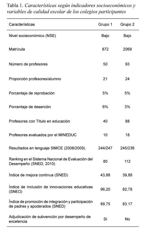 Para la selección de colegios, los establecimientos fueron igualados a razón del nivel socioeconómico y del rendimiento en pruebas de desempeño lector nacional, pero diferenciados en función de varios índices de calidad educativa (ver Tabla 1)