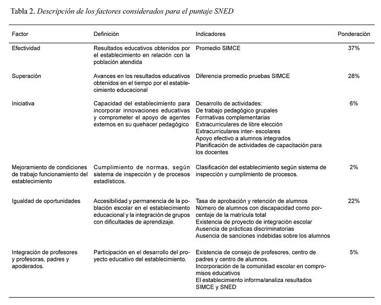 La diferenciación en términos de la calidad institucional se realizó según la evaluación del Sistema Nacional de Evaluación del Desempeño (SNED). En ésta se consideran como factores la efectividad del colegio, superación, iniciativa, mejoramiento, igualdad de oportunidades e integración y participación de padres y profesores (ver Tabla 2).