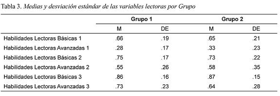 Para el análisis del nivel lector se consideró como variable dependiente de seguimiento el Desempeño Lector General que arroja Jugando con las Letras. Tanto al inicio de la investigación (M =0,49, DS=0,17) como al final (M=0,75, DS=0,20) se observan rendimientos bajo lo esperado, sin cambios significativos entre estas mediciones. Al realizar comparación entre grupos para los tres indicadores de Jugando con las Letras, al inicio y al final del estudio, se encuentra homogeneidad en términos de rendimiento lector.