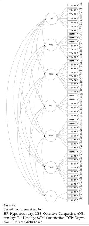 The tested model proposed a first-order factorial structure where 50 observed elements (psychopathology symptoms) were loaded in seven clinical scales (see Figure 1). For the cross-validation analyses and invariance testing the software EQS 6.2 was used. Due to the categorical nature of the items (Likert scaled), the estimation method ran for both analyses was robust maximum likelihood, using the polychoric correlation matrix. This type of method and matrix are more appropriate when variables are ordinal and when there is evidence of high values of skewness and kurtosis (Freiberg Hoffmann, Stover, de la Iglesia, & Fernández Liporace, 2013; Muthén & Kaplan, 1985).