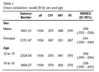 First, cross-validation analyses were conducted to test if the fit of the model prevailed in samples differentiated by sex and age. Thus, the male and the female subsamples were tested separately. As seen in Table 1, fit indexes showed to be an excellent fit for both groups. Model fit was also tested in two age samples: adolescents aged 12-15 years and 16-18 years. Again, fit indexes showed the appropriateness of the model (Table 1).