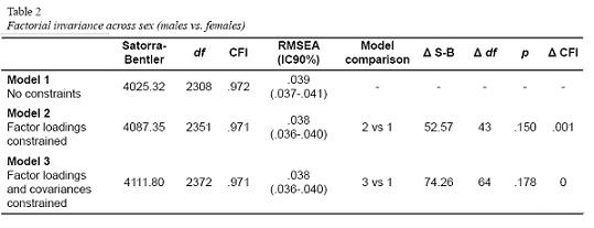 Additionally, hierarchical models with constrains were studied in order to analyse factorial invariance. To study invariance between the samples differentiated by sex, the fit was firstly tested in a model without constraints (MODEL 1). Both CFI and RMSEA values were adequate (see Table 2). A second model (MODEL 2) imposed constraints in all factor loadings. Again, model fit showed the expected values. The third and last model tested (MODEL 3) also imposed constraints in covariances. In this case, model fit was also correct.