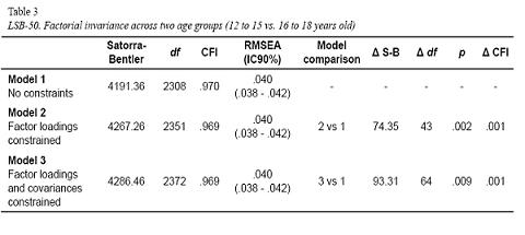 The purpose of this research was to study the psychometric properties of the LSB-50 (de Rivera & Abuín, 2012) in a sample of Argentinean adolescents. The results of the present study found support for the seven-factor structure in the cross-validation and factorial invariance. In the former, the model exhibited good fit in female and male samples as well as in the younger and older groups. Factorial invariance was found in all the proposed models, which entailed different restrictions of equivalency. However, the ΔS-B was statistically significant when studying invariance across the age, while the ΔCFI was minimal, indicating a good overall fit of all models (Byrne, 2006). Moreover, the goodness of fit was also reach at the level of the item, providing a more strict proof of construct validity than when the sum of scores are used as input values for factorization.