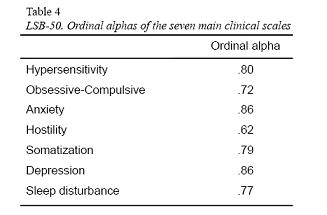 Finally, in regards to internal consistency, as stated, previous studies commonly used Cronbach’s alphas for its assessment. In general, psychopathology screening measures showed good results when using this procedure (e.g. Abuín & de Rivera, 2014; Caparrós Caparrós et al., 2007; Carrasco Ortíz et al., 2003; Casullo & Castro Solano, 1999; Ruipérez et al., 2001). However, Elosúa and Zumbo (2008) proposed the use of ordinal alphas as a more appropriate choice when scores are obtained in Likert scales. In this study, the ordinal alphas for the seven scales of the LSB-50 indicated good internal consistency.