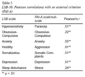 Finally, in order to obtain evidences of validity by external criterion, Pearson correlations were calculated between the clinical scales of the LSB-50 and their paires of the PAI-A. The association between the LSB-50’s Hypersensitivity scale and Paranoia was positive and moderate (r = .51; p < .001). The Obsession-Compulsion scale showed a positive but low correlation
