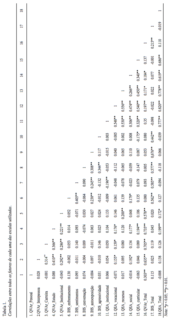A subescala Envolvimento Institucional do QEA correlacionou-se com o fator Autoafirmação na Expressão de Sentimento Positivo (r = -0.196, p< .05) do IHSde formanegativa efraca. Já as demais correlações ocorreram de forma positiva e fraca: a subescala Envolvimento Vocacional do QEA com as dimensões Interpessoal (r = 0.155, p< .01), Carreira (r = 0.159, p< .01) e Estudo (r = 0.176, p< .01) do QVA-r. A subescala Utilização de Recursos do QEA com a dimensão Institucional (r = 0.200, p< .05) do QVA-r. A subescala Envolvimento Social do QEA com as dimensões Interpessoal (r = 0.192, p< 0.01) e Estudo (r = 0.177, p< .01) do QVA-r. A subescala Envolvimento Social do QEA com o fator Enfrentamento e Autoafirmação com Risco (r = 0.179, p< 0.01) do IHS. Finalmente, a subescala Envolvimento Curricular do QEA também correlacionou-se com a subescala Estudo (r = 0.194, p< .05) do QVA-r.