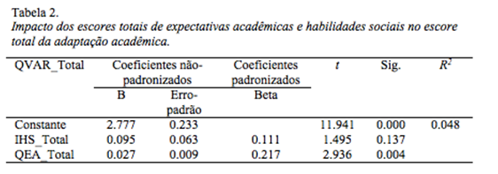 Tabela 2: Impacto dos escores totais de expectativas acadêmicas e habilidades sociais no escore total da adaptaçao acadêmica.