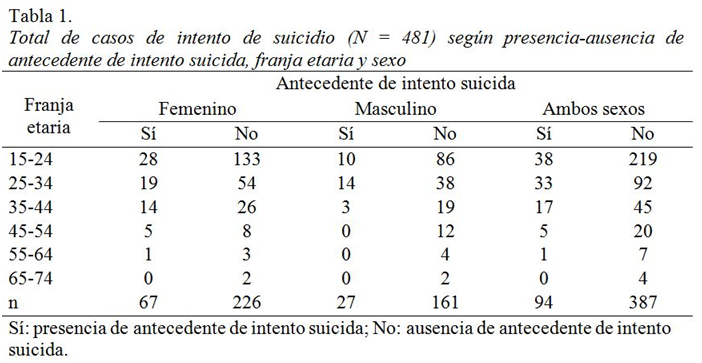 Del total de pacientes asistidos por intento de suicidio, sólo el 19.54% había realizado uno o más intentos suicidas anteriores. La razón entre casos sin antecedente - con antecedente de intento suicida fue de 3.37 a 1 en el sexo femenino y de 5.96 a 1 en el masculino. La razón entre sexos (femenino-masculino) fue de 2.48 a 1 en casos con antecedente de intento suicida y de 1.40 a 1 en casos sin ese antecedente (ver tabla 1). Las diferencias según sexos fueron estadísticamente significativas (χ2 (1) = 5.27, p< .05). Antecedente de intento suicida caracterizó diferencialmente al sexo femenino respecto del masculino, aunque la fuerza de la asociación hallada fue muy débil (V = 0.10).