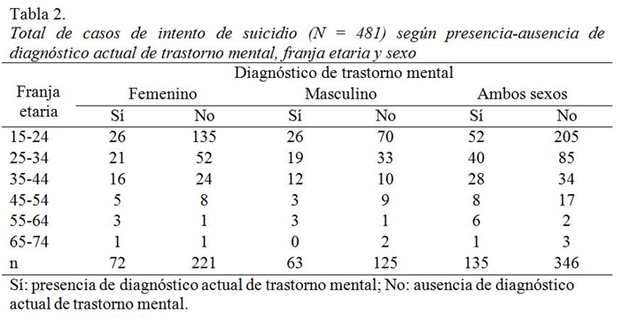 Del total de pacientes asistidos por intento suicida, sólo el 28.07% tenía diagnóstico de trastorno mental. La razón entre casos sin diagnóstico - con diagnóstico de trastorno mental fue de 3.07 a 1 en el sexo femenino y de 1.98 a 1 en el masculino. La razón entre sexos (femenino-masculino) fue de 1.14 a 1 en casos con diagnóstico de trastorno mental y de 1.77 a 1 en casos sin esos diagnósticos (ver tabla 2). Las diferencias según sexos fueron estadísticamente significativas (χ2 (1)=4.52, p< .05), aunque la fuerza de la asociación hallada fue muy débil (V = 0.10). La presencia de diagnóstico de trastorno mental caracterizó diferencialmente al sexo masculino respecto del femenino.