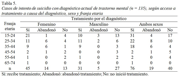 - Acceso a tratamiento a causa del diagnóstico de trastorno mental: se analizó si los pacientes que tenían diagnóstico de trastorno mental asistían a tratamiento psicológico y/o psiquiátrico (en cualquier modalidad) al momento del intento suicida. En función de ello, se contabilizó cada caso en una de tres categorías de tratamiento: Recibe tratamiento (pacientes que al momento del intento suicida asistían a tratamiento); Abandonó tratamiento (pacientes que habían iniciado tratamiento pero que previo al intento suicida lo habían abandonado); No inició tratamiento (pacientes que nunca iniciaron tratamiento pese a haber sido diagnosticados con trastorno mental previo al intento suicida).