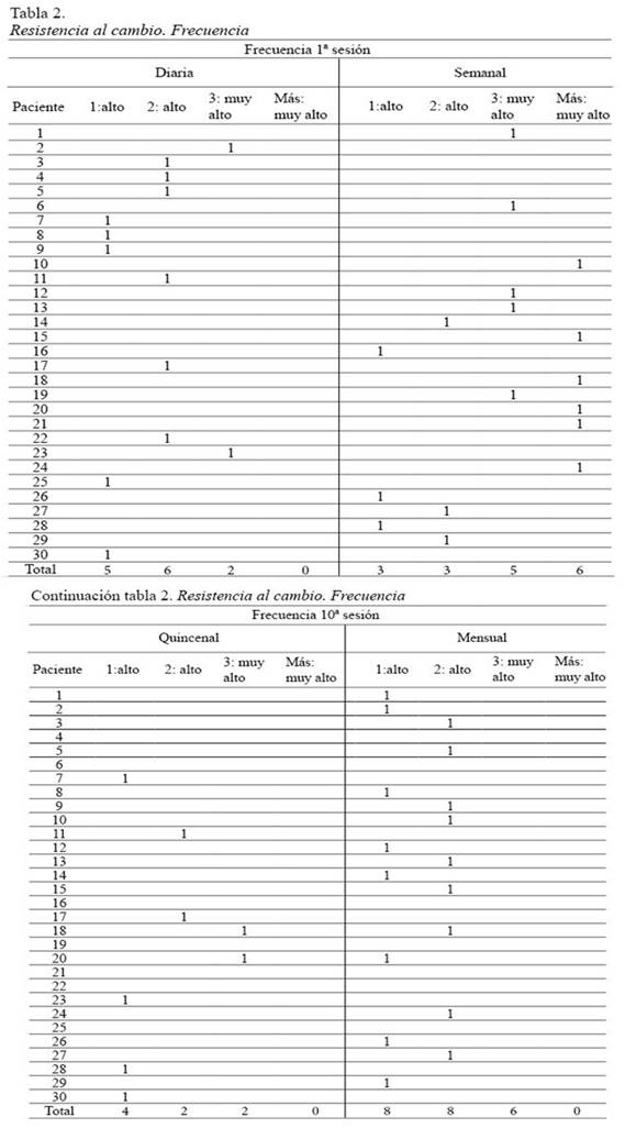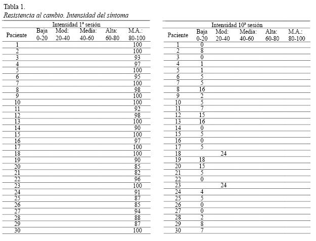 a) Intensidad del síntoma problema: la tabla 1 registra la “intensidad” de la aparición sintomática en un parámetro de 0 a 100, cotejando la sesión 1 y la 10.