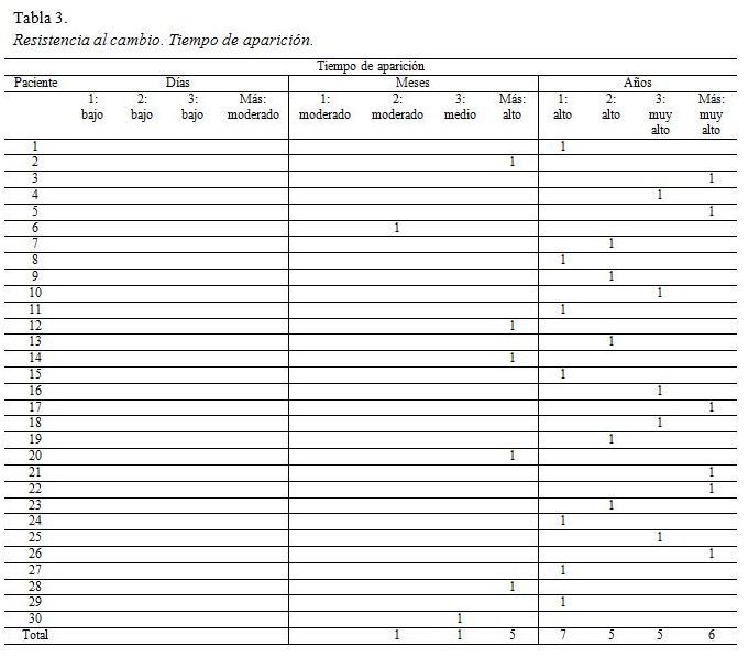El resto se ubican en años, con un rango “alto” de 1 y 2 años (7/30 y 5/30 respectivamente), y 3 y más de 3 años (muy alto) 5/30 y 6/30 respectivamente). La sistematización y convivencia con el síntoma hace que se regularicen los mismos intentos de solución, las mismas funciones y reglas del sistema. El trastorno se “encarna” no solo en el protagonista sino en el sistema, haciendo la tarea de desmontarlo, más dificultosa aún.