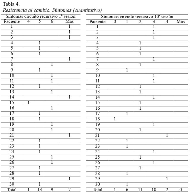 Resultados: En la tabla 4 se observa que casi el 50% de los pacientes rondaron en el encadenamiento de 5 síntomas. El resto se observa (9/30) con 6 síntomas y más de 6 (7/30); se discriminó solamente un paciente con 4 síntomas. La evaluación a la 10º sesión se observó que 27/30 pacientes oscilaron entre 3 y 1 síntoma: solamente un paciente asintomático y 2/30 con 4 síntomas. Tengamos en cuenta que estos pacientes venían de una producción sintomática de más de 6 síntomas, razón por la cual dicha reducción es significativa. En general es una reducción significativa, no definitiva y que deberá sostenerse en el tiempo, que en el caso de los trastornos de pánico, no es sencillo mantener por la ilación de síntomas y por la tendencia a las profecías autocumplidoras. Un síntoma aislado puede ser motivo de crear la cadena panicosa.
