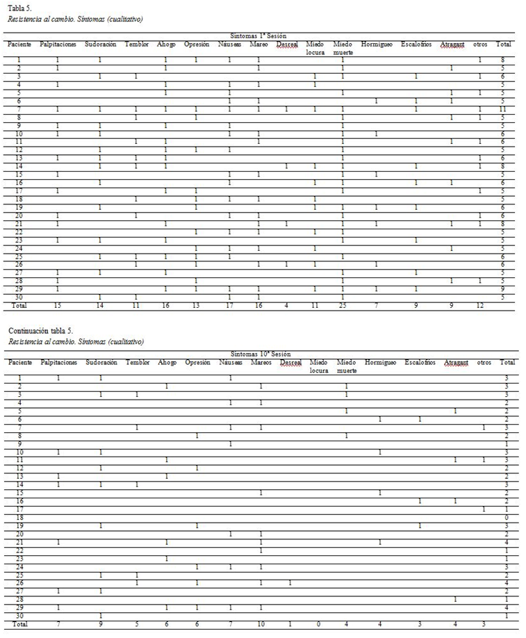 Dado que para diagnosticar un trastorno de pánico es necesaria la presencia de un mínimo de 4 síntomas, la tabla 4 parte de la presencia de 4 síntomas en la evaluación de la sesión 1. La sesión 10, en cambio, muestra desde 1, 2, 3 y más síntomas ya que se espera una reducción de la sintomatología. La quinta tabla especifica cuáles son los síntomas que aparecen en la sesión 1 y los que se mantienen o desaparecieron en la sesión 10.