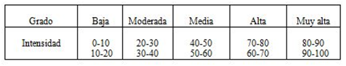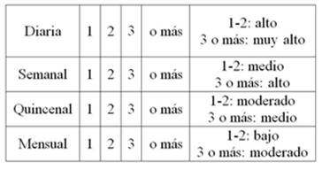 b) Frecuencia de aparición: la tabla 2 muestra la “Frecuencia” de la aparición del síntoma, midiendo la frecuencia diaria, semanal, quincenal y mensual, con la gradación baja, moderada, media, alta y muy alta.