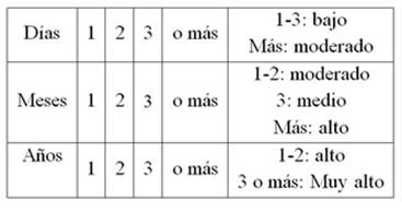 Aisladamente, se observa 1/30 (moderado) de dos meses y 1/30 (medio) tres meses, 5/30 (alto) de aparición de más de tres meses.