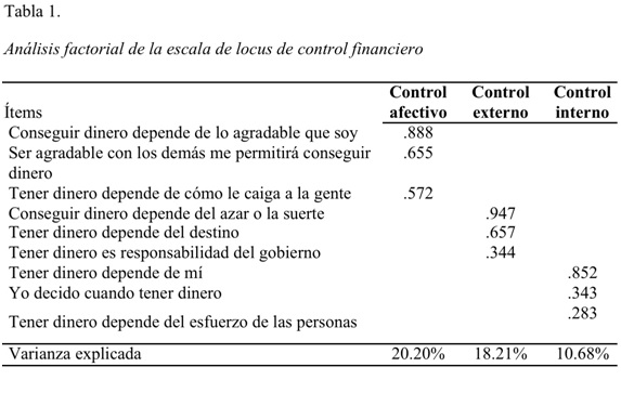 La evaluación del control que tengan las personas sobre el dinero fue medido por medio de factores que describen un conjunto de acciones para obtenerlo. La medición del constructo de locus de control en este estudio mostró que es posible medirlo a través de tres factores que se presentan de forma consistente en México. Derivado del análisis factorial exploratorio se puede observar que el primer factor obtenido, adjudica el logro del dinero a causas afectivas (locus de control financiero afectivo); el segundo factor alude a causas externas como la suerte (locus de control financiero externo); el último factor señala que tener dinero es atribuido a la decisión propia (locus de control financiero interno). La estructura de estos tres factores es similar a lo encontrado en otros estudios (Correa et al., 2006; Díaz- Loving et al., 1984; García et al., 2000; La Rosa et al.,1986; Vera et al., 2000) quienes encuentran dimensiones referentes a las causas por las que las personas adjudican la responsabilidad de su conducta.
