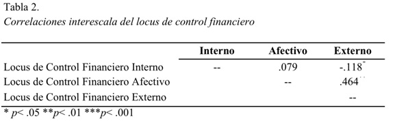 Adicionalmente, al realizar el análisis de medias de cada subescala, los universitarios obtuvieron la mayor puntuación en el locus de control financiero interno (3.99), seguido del control afectivo (2.18) y por último el locus externo (1.88). Los resultados obtenidos tanto para las correlaciones interescala como para el análisis de medias, parecen indicar que a pesar de tener la media más alta en el control financiero interno, las contingencias de aprendizaje para obtener dinero de los universitarios mexicanos (al menos en esta muestra), presenta una tendencia externa y socio-afectiva. Dichos resultados (mayor puntuación del control financiero interno) apoya lo señalado por Perry y Morris, 2005, respecto a tener mejor conducta financiera en quienes tienen locus de control interno, y parece contradecir las conclusiones de algunos autores (Díaz- Guerrero, 1994; García et al., 2000; Laborín et al., 2008; Triandis et al., 2002) al señalar que los países con culturas colectivistas tienen un locus de control externo. Lo anterior parece indicar que, la sociedad juvenil mexicana representada en esta muestra por estudiantes universitarios, cuando se encuentran bajo determinadas situaciones para conseguir dinero, perciben que las contigencias internas controlan de mejor manera su forma de obtener dinero.