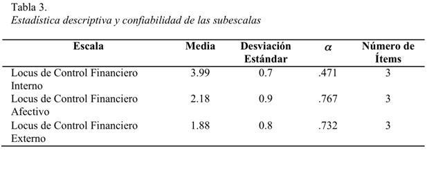 La tabla 3 muestra la estadística descriptiva de las subescalas, en donde se observa que la mayor puntuación es para el control financiero interno, seguido del control financiero afectivo y por último, la puntuación promedio más baja la tiene el control financiero externo. En la misma tabla se aprecian los niveles de confiabilidad, en donde se destaca que el control financiero afectivo y el control financiero externo tienen una confiabilidad aceptable, no así para el control financiero interno que su nivel de fiabilidad se encuentra por debajo de lo permitido.