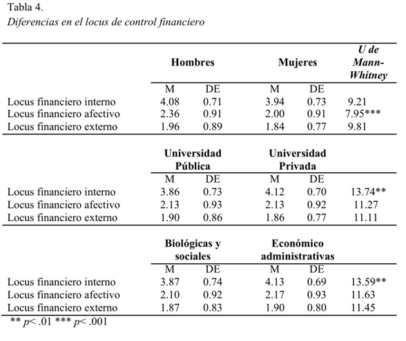 La tabla 4 muestra las comparaciones a través de la prueba U de Mann-Whitney del locus de control financiero y las variables demográficas (sexo, tipo de carrera y universidad). Se encontraron diferencias estadisticamente significativas entre hombres y mujeres, los primeros puntúan más alto únicamente en el locus financiero afectivo comparado con las mujeres; es decir, que los hombres para obtener dinero utilizan las relaciones con las otras personas para conseguirlo. Los estudiantes de la universidad privada y los que son de las áreas económico-administrativas tienen un mayor locus financiero interno, es decir, este tipo de universitarios, decide el momento de obtener dinero y consideran que tener dinero depende de las acciones que ellos realicen para conseguirlo, comparado con los universitarios de la universidad pública o con un universitario que estudia en las áreas biológicas y sociales. Para el caso del locus financiero afectivo y externo, los universitarios obtuvieron puntuaciones de manera similar.