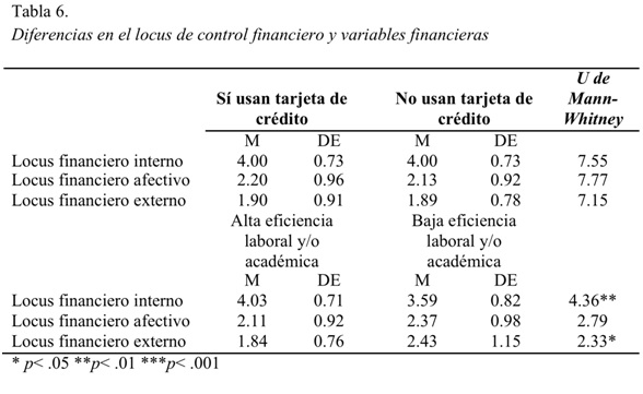 Al obtener las diferencias en las variables financieras (uso de tarjeta de crédito) y laborales (clasificación de eficiencia en las cosas que realizan) se encontró que no existen diferencias estadísticamente significativas entre los universitarios que usan tarjeta de crédito y los que no usan, respecto a su control financiero, ya sea interno, afectivo o externo. Para conocer las diferencias en el nivel de eficiencia en actividades en el trabajo y/o académicas se formaron dos grupos (alta y baja eficiencia laboral y/o académica) a partir de la mediana. Se observa que quienes manifiestan tener mayor eficiencia en las actividades que realizan poseen un mayor control financiero interno, a diferencia de los de baja eficiencia. De manera contraria el control financiero externo mostró diferencias significativas a favor de quienes consideran tener bajos niveles de eficiencia en las actividades que realizan, comparado con los de alto nivel de eficiencia (ver tabla 6), en otras palabras, quién es más eficiente posee un locus financiero interno y quién es menos eficiente cuenta con un locus financiero externo.