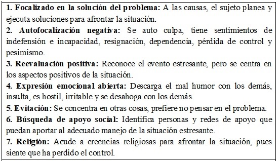Bajo este marco conceptual, Sandín y Chorot (2003) refieren al Afrontamiento como un “rasgo” o disposiciones personales desplegadas a través de Estilos de Afrontamiento al Estrés a los cuales las personas tenderán a recurrir ante la interacción entre su percepción de una situación y la situación en sí misma. Tales estilos son los siguientes: (1) Focalizado en la solución del problema, (2) Autofocalización negativa, (3) Reevaluación positiva, (4) Expresión emocional abierta, (5) Evitación, (6) Búsqueda de apoyo social, y (7) Religión (Véase Figura 1).
