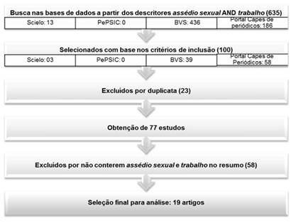 Inicialmente, foram localizados 635 artigos a partir dos descritores, 100 foram selecionados por atenderem aos critérios de inclusão, 23 foram excluídos por duplicata e 58 foram excluídos por não conterem os termos assédio sexual e trabalho no resumo. Dessa forma, 19 artigos foram selecionados para a análise, conforme demonstrado na Figura 1. As informações obtidas foram compiladas em um banco de dados para categorização, mediante análise de conteúdo (Bardin, 2011).