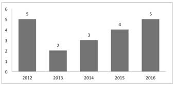 Quanto ao ano de publicação, no período compreendido entre 2012 e 2016, os anos de 2012 e 2016 contaram com a maior quantidade de publicações e o ano de 2013 contou com a menor quantidade de publicações, demonstrado na Figura 3.