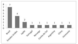Verificou-se, também, diversidade no país de origem dos estudos, com a predominância do Brasil como país de origem com maior quantidade de publicações, seguido pelos Estados Unidos, Japão e, pelos demais países, como Portugal, Noruega, Coréia do Sul, Argentina, China e Venezuela, conforme Figura 5.