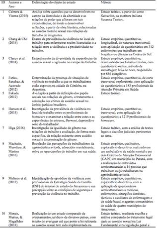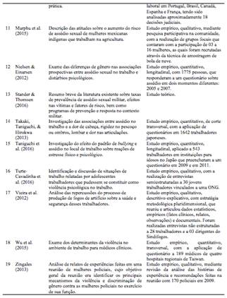 Na maioria dos estudos analisados, o assédio sexual no trabalho surge como resultado de pesquisas que delimitam a violência no trabalho como objeto de estudo (ver Tabela 1). Dessa forma, uma das compreensões do assédio sexual no trabalho adotada é como sendo um tipo de violência psicológica no trabalho (Chang & Cho, 2016; Farias, Sanchez, & Acevedo, 2012; Hanson et al., 2015; Machado, Murofuse, & Martins, 2016; Molinos et al., 2012; Turte-Cavadinha et al., 2014, Wu et al., 2015; Zingales, 2013). Nesse sentido, ressalta-se a necessidade da realização de estudos que focalizem o assédio sexual no trabalho como alvo principal de investigação.