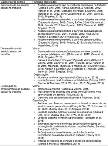 A análise dos estudos possibilitou a compreensão do assédio sexual no trabalho a partir de quatro perspectivas: assédio sexual no trabalho como tipo de violência psicológica no trabalho; assédio sexual no trabalho compreendido a partir de relações de poder; assédio sexual no trabalho compreendido a partir da desigualdade de gênero; e assédio sexual no trabalho compreendido a partir do aspecto jurídico. Nota-se que alguns estudos adotam mais de um enfoque de compreensão da temática. Também foi possível identificar as consequências do assédio sexual no trabalho para a vítima e para as organizações; e as estratégias de enfrentamento ao assédio sexual no trabalho, promovidas pelas vítimas e pelas organizações.