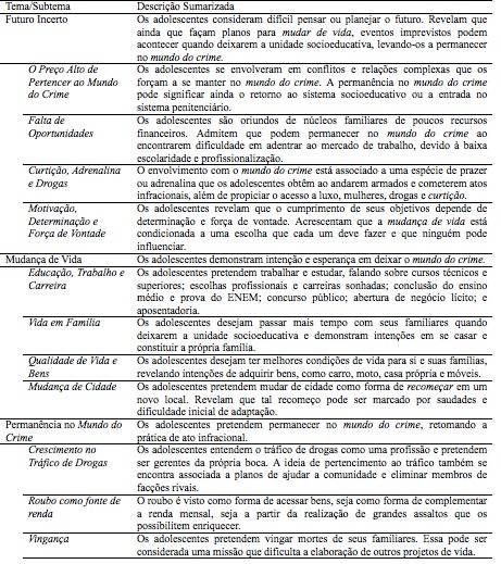 Os resultados sugerem que os adolescentes apresentaram um sentido de ação como forma de atingirem seus objetivos ligados ao mundo do crime. Manifestaram-se criticamente com relação aos acontecimentos passados e presentes, cientes das (im)possibilidades de mudanças no futuro. Esses participantes possuem, assim, projetos de vida associados à permanência no mundo do crime. Esses projetos estão relacionados não apenas ao desenvolvimento de uma carreira, mas a um estilo de vida compactuado por uma cultura do crime, que é recorrentemente chamada mundo do crime.