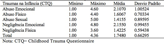 O CTQ é composto por 28 questões que avaliam a presença de eventos traumáticos (negligência e abuso) na infância e adolescência. Cada dimensão do instrumento é composta por 5 questões com escala do tipo Likert de cinco pontos que variam entre 1 (nunca) e 5 (quase sempre): abuso emocional (AE), abuso físico (AF), abuso sexual (AS), negligência emocional (NE) e negligência física (NF). As demais três questões formam a escala do controle de confiabilidade das respostas. Estudos de confiabilidade e validade atestam as boas propriedades psicométricas do instrumento original (Bernstein & Fink, 1998). No estudo, foi utilizada a versão em português (Grassi-Oliveira et al., 2006) que na presente amostra apresentou fidedignidade, avaliada com coeficiente alpha de Cronbach, de 0,93 para a escala total e entre 0,66 e 0,94 nas subescalas.