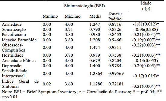 Não foram detectadas diferenças significativas nas médias de homens e mulheres no IGS e nas dimensões de sintomas, com exceção de somatização, que foi maior nas mulheres (t = 2,088; p = 0,038). Idade apresentou correlação negativa significativa com diversos grupamentos de sintomas e com o IGS.