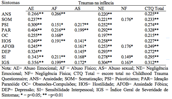Os resultados das correlações entre traumas na infância (avaliados pelo CTQ) e sintomatologia na vida adulta (avaliados pelo BSI) mostram que há relação positiva e significativa entre os diferentes traumas e uma ampla variedade de sintomas psicopatológicos, incluindo o sofrimento psicológico geral (IGS do BSI), conforme Tabela 3.