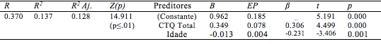 A seguir, realizou-se regressão linear (método Backward) para verificar o efeito dos traumas (Variável independente: CTQ total) sobre a severidade da psicopatologia global (Variável dependente: GSI). Como a variável idade apresentou associação com os sintomas, esta foi incluída como possível preditora. Somente um modelo foi gerado, indicando que, em conjunto, os traumas na infância e a idade explicam 13% da variância da severidade geral dos sintomas, conforme apresentado na Tabela 4.