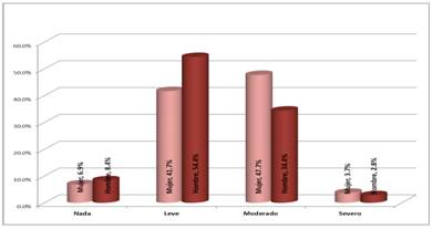 El resultado en mujeres podría estar relacionado con una mayor predisposición y ventaja social a evidenciar y mostrar externamente su dolor emocional y físico. Es importante destacar que en ambos sexos la depresión es fluctuante con rangos superiores al 30%, en donde, de cada 100 casos, 40 se verían afectados a nivel leve y moderado y sólo 3 de cada 100 se verían afectados por la depresión de una manera severa, evidenciándose un rango de aproximadamente 6% que no presentan depresión.