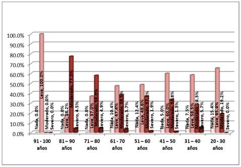 En cuanto a la edad hay un incremento de la incidencia de la depresión a nivel moderado en la medida que se envejece; en tanto, los niveles de depresión leve son mayores a menor edad y luego se incrementan exponencialmente a partir de los 90 años, para esta población (ver Figura 4).