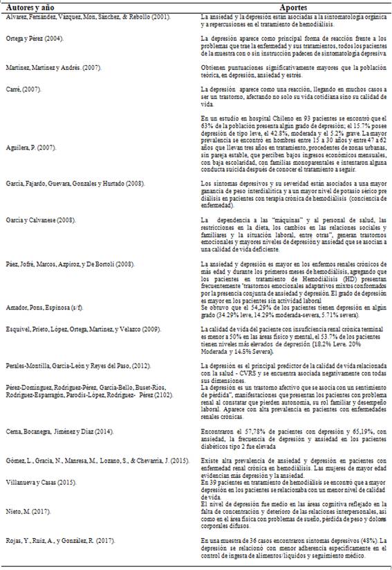La depresión aparece en las distintas etapas de progresión de la enfermedad renal, con alta prevalencia sobre todo en pacientes renales crónicos en tratamientos de hemodiálisis; su sintomatología psicosomática y emocional, afecta el proceso y manejo de la enfermedad renal y tratamiento, las consecuencias emocionales e interacciónales en la vida del paciente repercuten significativamente en su adherencia y calidad de vida (Pérez-Domínguez et. al., 2012).