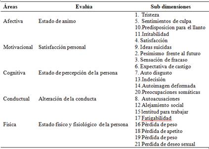 Beck (1976) desarrolló esta prueba basada en su teoría cognitiva y clasificó en áreas y subdimensiones, estructurándose según se detalla en la Tabla 2.
