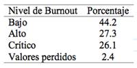 Respecto a los niveles de burnout, prevalece un bajo nivel, seguido por un alto grado de afectación y por niveles críticos (Tabla 2). Esta última categoría se relaciona con altos niveles de riesgo para experimentar sintomatología física y psicológica relacionada con el burnout.