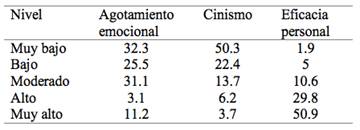 Respecto a las dimensiones de la escala MBI-GS Burnout, puede notarse en la tabla 3 que la eficacia personal es la que presenta mayores niveles, seguido por el agotamiento emocional y en menores niveles el cinismo. Tabla 3