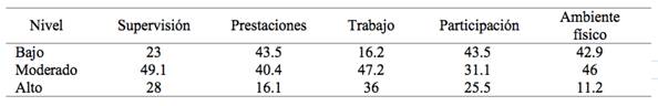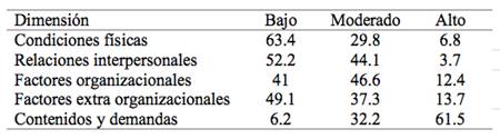 En cuanto a los niveles de estrés laboral, los niveles más altos se encontraron en la dimensión contenido y demandas del trabajo, seguido por los factores extra organizacionales. Los controladores reportaron como menos estresante las condiciones físicas del trabajo y el clima interpersonal (Tabla 4).