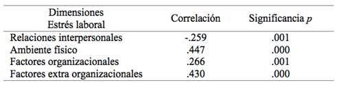 Además, se encontró que en la medida que se identifican a los factores organizacionales y a los extra organizacionales como desencadenantes del estrés, también aumenta la percepción de mayor conflicto trabajo-familia (r= .397; p=.000 y r= .604; p=.000, respectivamente).
