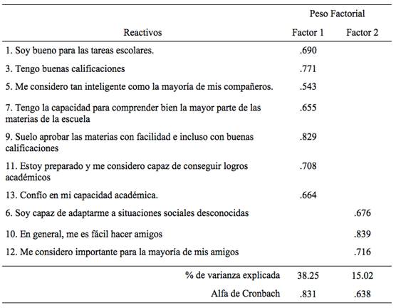 Respecto a los resultados de la primera escala que evalúa Competencia, los análisis arrojaron tres factores que explicaron el 54.23% de la varianza, sin embargo, debido a que en el tercer factor sólo quedaba un reactivo se eliminó y solo quedaron dos factores que explicaron el 50.93% de la varianza. Como se puede observar en la Tabla 2, en el primer factor se agruparon siete reactivos que evalúan la percepción del adolescente sobre su competencia académica, en el segundo factor se agruparon tres reactivos respecto a la percepción de los adolescentes sobre la competencia social. La confiabilidad para el total de la escala de Competencia fue de α = .809, lo cual indica una consistencia interna adecuada; al hacer el análisis por cada factor, los resultados mostraron una confiabilidad más alta en la competencia académica (α = .831) respecto a la competencia social (α = .638).