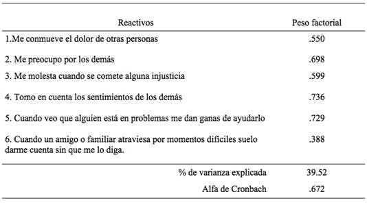 En cuanto a los resultados de la escala de Cuidado (ver Tabla 3), los análisis indicaron que los seis reactivos se agruparon en un solo factor que explicó el 39.52% de la varianza; la consistencia interna de la escala se encontró en parámetros aceptables (α = .672).