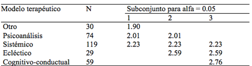 Luego, se realizó el análisis de varianza (ANOVA) (ver Tabla 2) de un factor donde se contempló sólo los pacientes en los que se observaron diferencias estadísticamente significativas en los niveles de rechazo por parte de los diferentes psicoterapeutas, según el modelo terapéutico con el cual trabajan - sistémicos, cognitivos-conductuales, psicoanalistas, eclécticos, otros-.