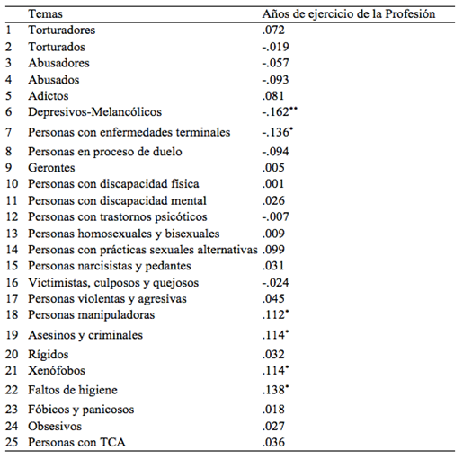 En la Tabla 4 se observan los resultados de las correlaciones entre los años de ejercicio de la Profesión y los temas de rechazo.